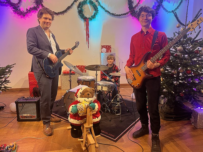 Hier spielt der Lehrer mit: Tilmann Albrecht, rechts im Bild, mit seinem Schlagzeugschüler und dessen Vater. Das Video dazu finden Sie hier.